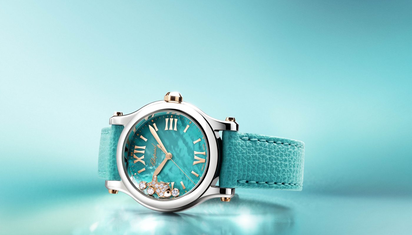Mittelpunkt des Designs ist ein Zifferblatt von seltener und strahlender Schönheit. Es verdankt seine Ausstrahlung dem meisterlichen Können von Chopard, Perlmutt zu bearbeiten. Dieses Material stammt aus der innersten schimmernden Schicht von ausgewählten Muscheln und fasziniert hier durch ein feines Türkis, dessen Farbton an die funkelnde Oberfläche eines tropischen Meeres erinnert. Über dieses bewegte Wasser tanzen drei Diamanten, begleitet von einem frei beweglichen Fisch in Ethischem Roségold, besetzt mit Diamanten und einem Onyx als Auge.