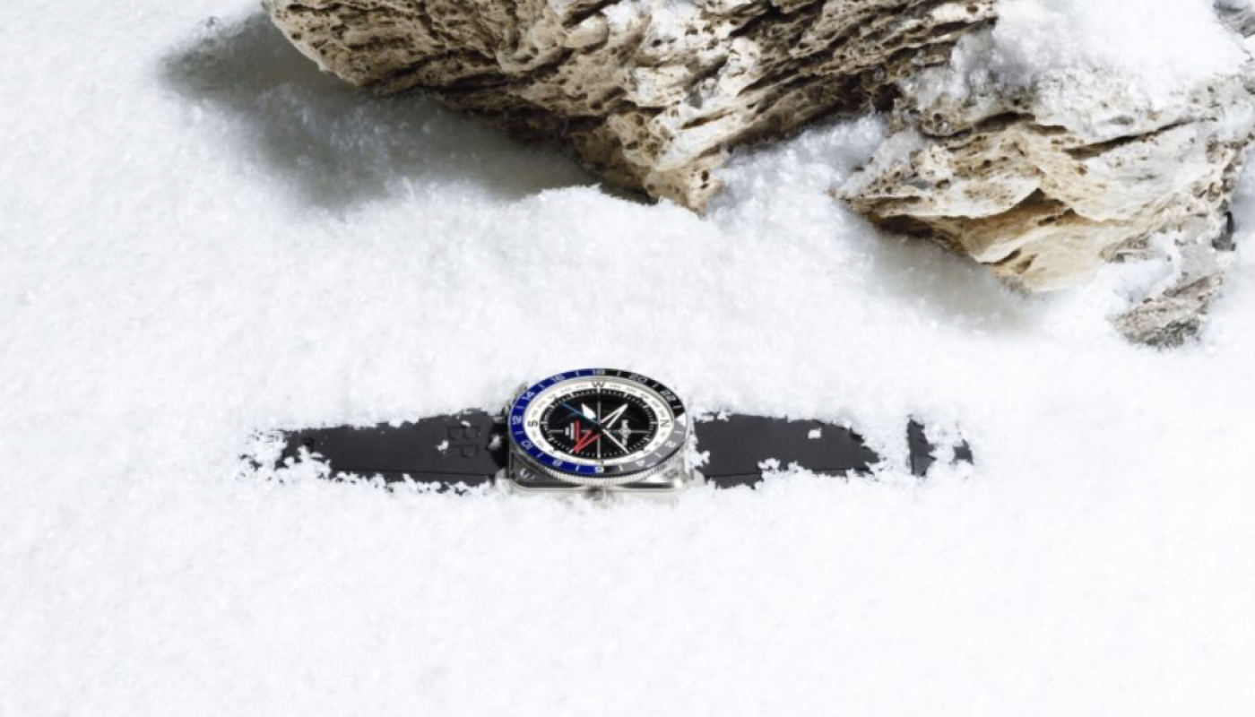 Das Kompassmotiv auf dem Zifferblatt der neuen BR-03 GMT Compass ist nicht nur dekorativ, sondern auch funktional. Mit der in Grad unterteilten Skala lässt sich die Uhr bei Sonnenschein als einfaches Navigationsinstrument verwenden. Durch die Kombination der Windrosen-Skala und des 24-Stunden-Zeigers der GMT-Funktion kann man eine Richtung bestimmen. Dieser Zeiger ist rautenförmig gestaltet – inspiriert von klassischen Magnetkompassen. Die vier Himmelsrichtungen (Nord, Süd, Ost, West) sind auf dem Höhenring markiert (bei 6, 12, 18 und 24 Uhr). Um eine Richtung zu bestimmen, orientiert man sich – wie bei einem Orientierungslauf – an der Sonnenposition: Die Uhr wird flach und parallel zum Boden gehalten, dann wird der GMT- Zeiger auf die Sonnenzeit eingestellt. Beispiel: Im Sommer in Genf beträgt der Unterschied zwischen Sonnenzeit und gesetzlicher Zeit zwei Stunden. Wenn es offiziell 14 Uhr ist, ist es solar betrachtet erst 12 Uhr. Danach richtet man den roten Zeiger auf die Sonne aus – die Richtung kann dann direkt an der Skala des Höhenrings abgelesen werden. So lässt sich, wie einst die Entdecker vergangener Zeiten, der eigene Kurs bestimmen.